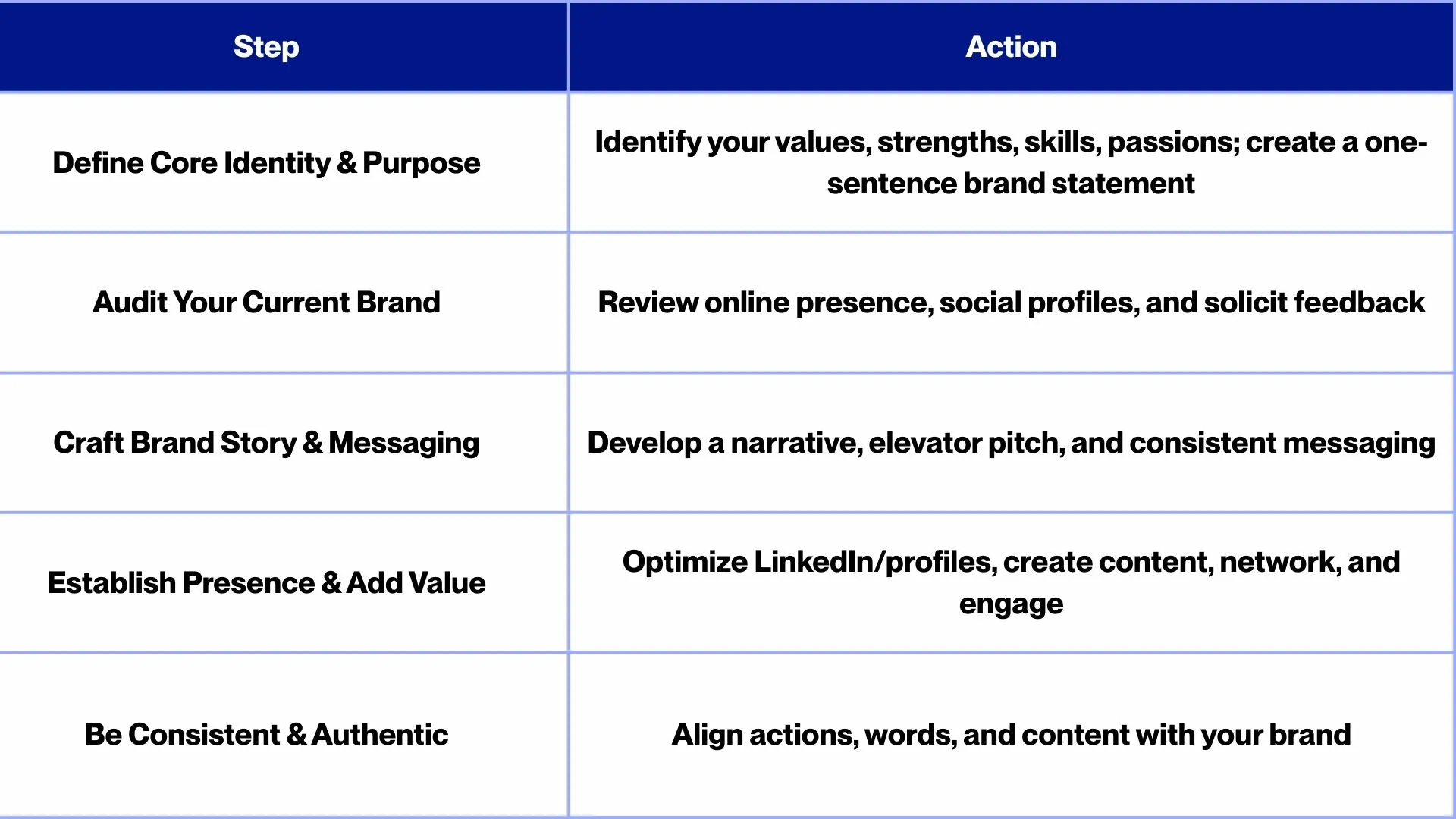 Now that we have covered the what and why of personal brand vs personal branding, the next question is how to put this knowledge into practice. Building a personal brand is a deliberate process that does not happen overnight. The following actionable steps and tips will help you build your brand through smart strategies.