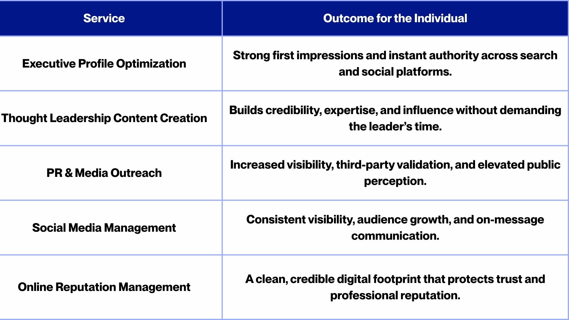 Their services range from executive brand strategy and media relations to speaker management and even crisis PR. They conduct comprehensive personal brand audits and strategy development for each client, then execute on content creation, such as ghostwriting LinkedIn articles, op-eds, and even helping launch personal podcasts or video series. They also fully manage clients’ social media presence across platforms and act as a personal publicist to secure press coverage in major outlets like Forbes, Bloomberg, and CNN. Prestidge is known for its 24/7 availability and ultra-customized strategies, essentially functioning as a full-time PR and branding team for the leader.