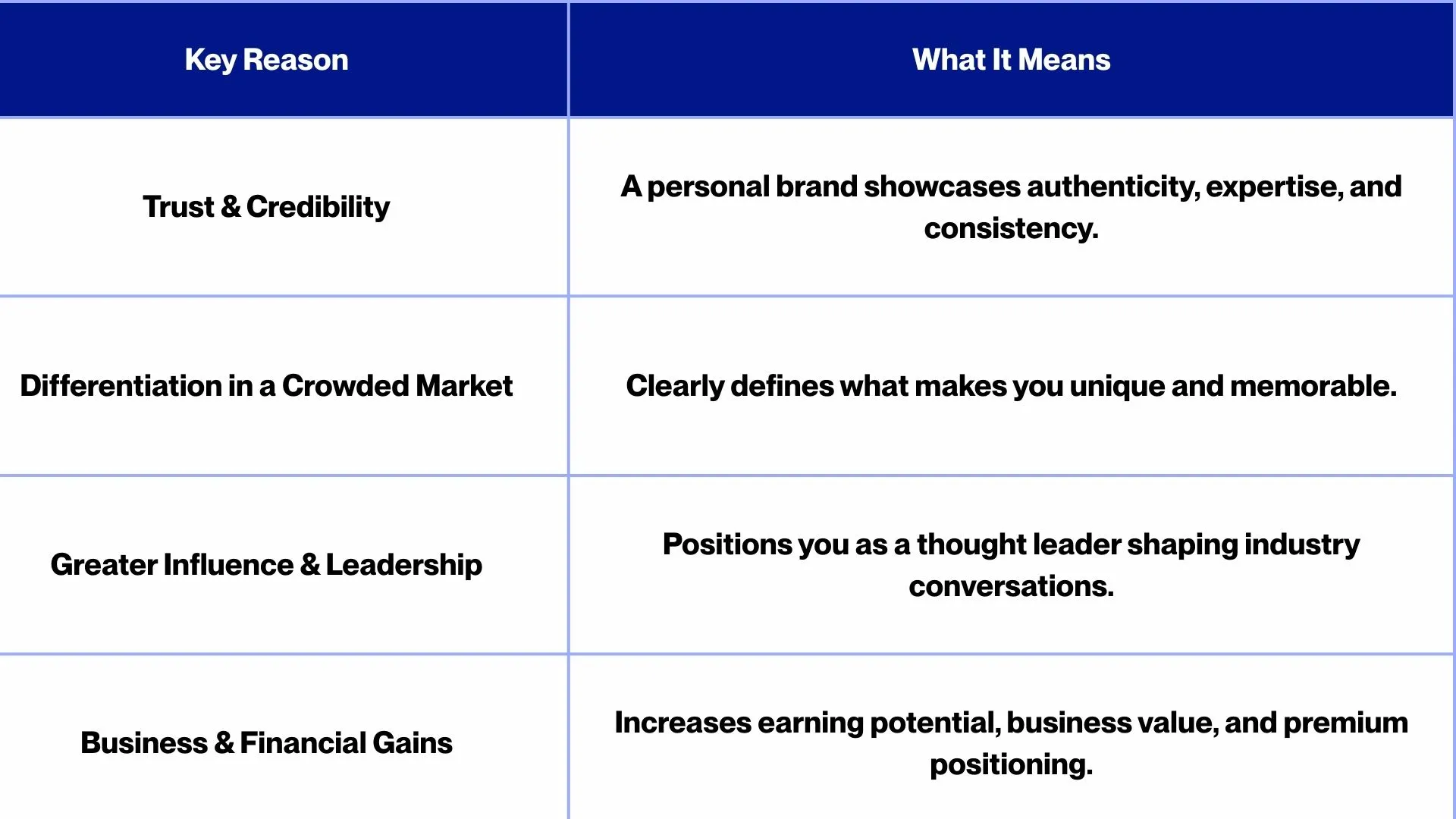 Strong personal brands translate into real business results. They can boost company performance and even its valuation as customers and investors alike attach credibility to the person at the helm. For example, nearly half of a company’s value can be tied to the leader's personal brand. On a personal level, your brand can increase your earning potential.Â